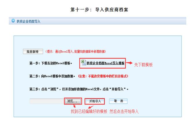 说明:(1)通过下载导入模板,将供货企业的信息批量导入系统中。