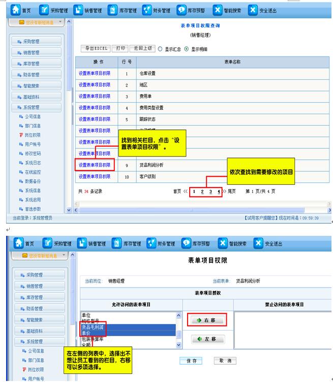 如果针对某个岗位,不想让他看到列表中的进货价格、金额或是客户等相关信息,可以进行如下操作