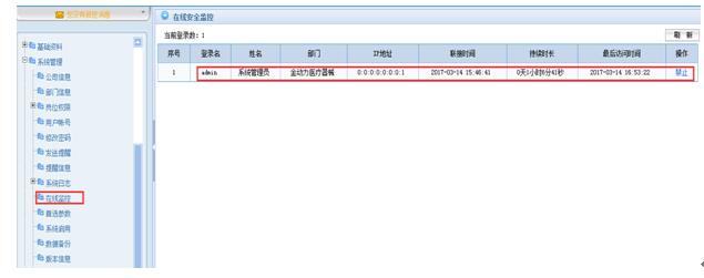 操作步骤:点击“系统管理”—“在线监控”,进入在线安全监控页面可以查看在线使用软件的情况(例如:登陆名,姓名,联接时间,IP地址,持续时长,最后访问时间)