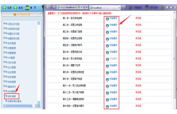 新手指南可以帮助客户从安装后接下来基础信息的录入指引,新手指南中,可以按照现有的顺序开始操作,也可以挑选的进行操作。灰色字体部分依赖于其他模块,当其他模块信息添加完成后,就会变成蓝色字体,可以操作了。