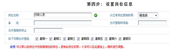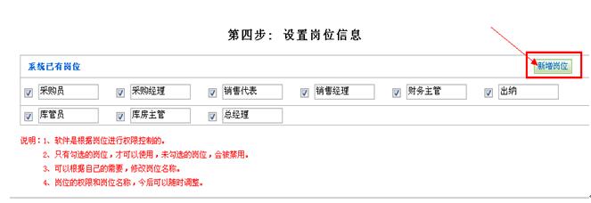 说明:目前系统中已经设置好一些重要岗位的名称和权限,您可以选择性的使用这些岗位。不需要的岗位可以去掉勾选,这样的话,这个岗位不会被系统留用。