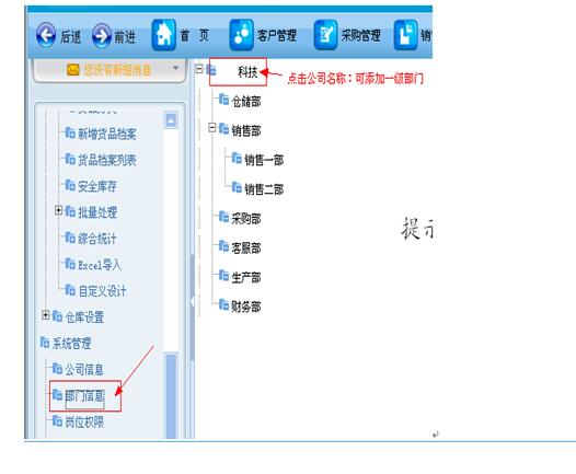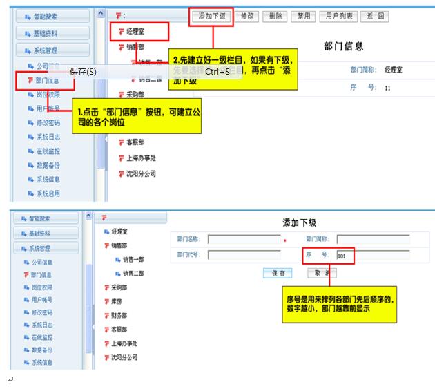 重要提示:如果您想添加某个部门的下一级信息,请选择要添加的部门名称;例如:(1.)先选中一级栏目——“销售部”(2.)点击 “添加下级”按钮,进行信息填写,点击“保存”按钮即可。