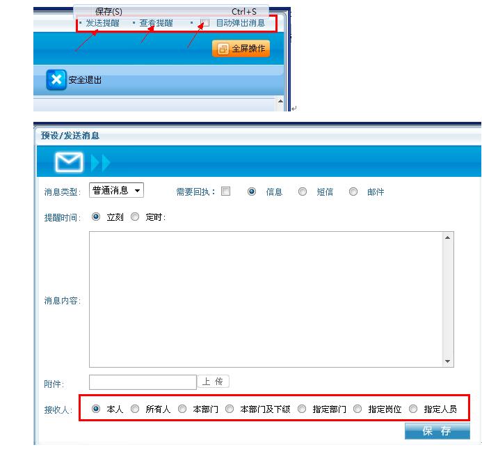 第一步:点击页面中的“发送提醒”按钮,给系统内部的员工发送内部消息,也可以对各自紧急事务,需要定时